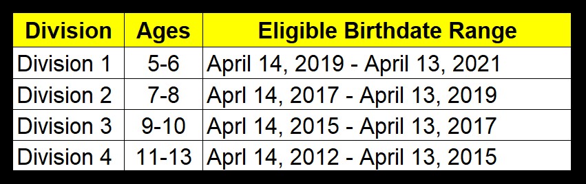 Player must be within the listed age range on or before April 13, 2026 to be eligible for the division. Using the chart below, select the division that corresponds with the registering childs birthdate.
